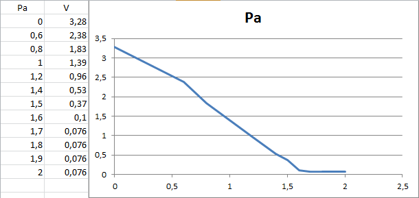 2 czujniki odrazu wyrzuciłem bo nic sie nie działo ale trzeci reaguje i to dość ładnie . Poniżej wykres i tabelka jak zachowuje się wyjście czyli O względem zadawanego ciśnienia na czujnik.